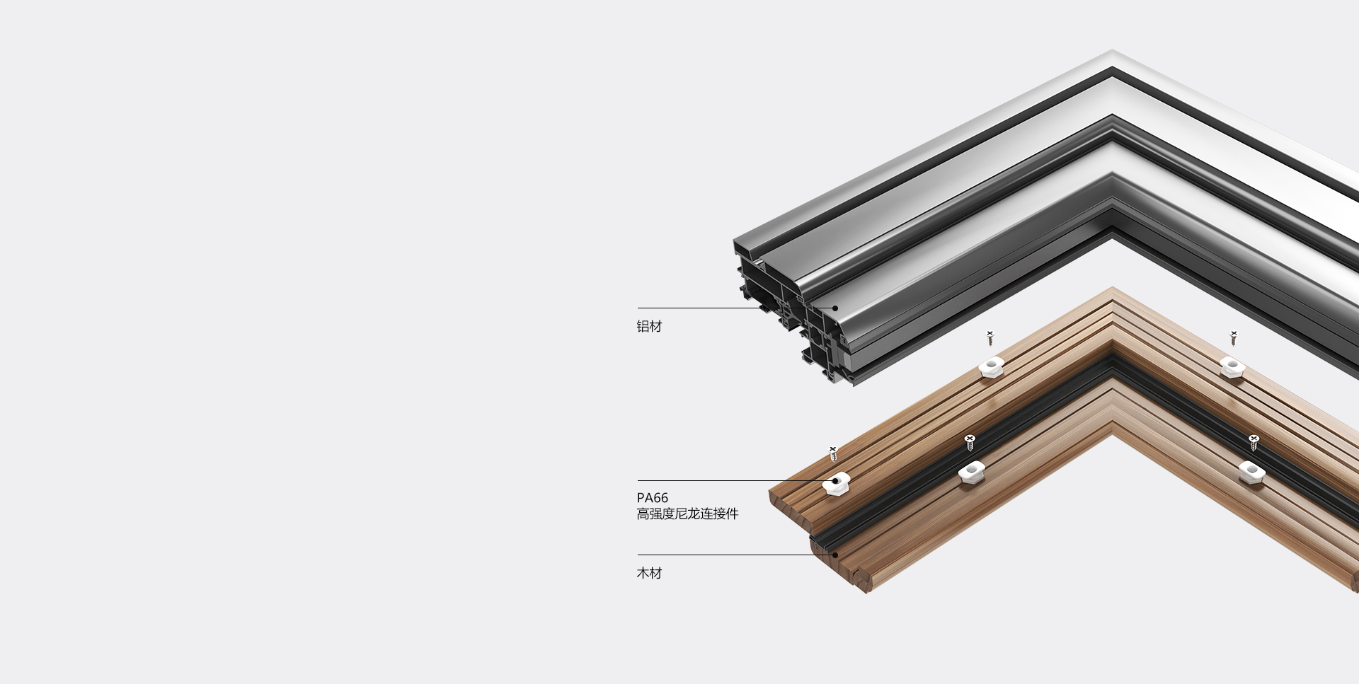 采用PA66高強度尼龍連接件,使木材懸浮在鋁合金表面,木、鋁不直接接觸。